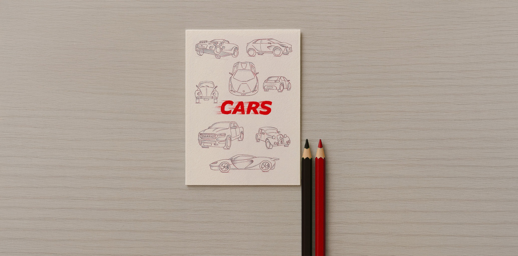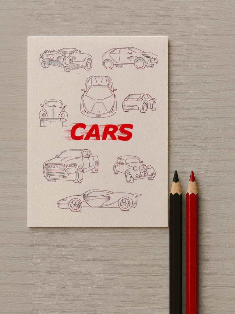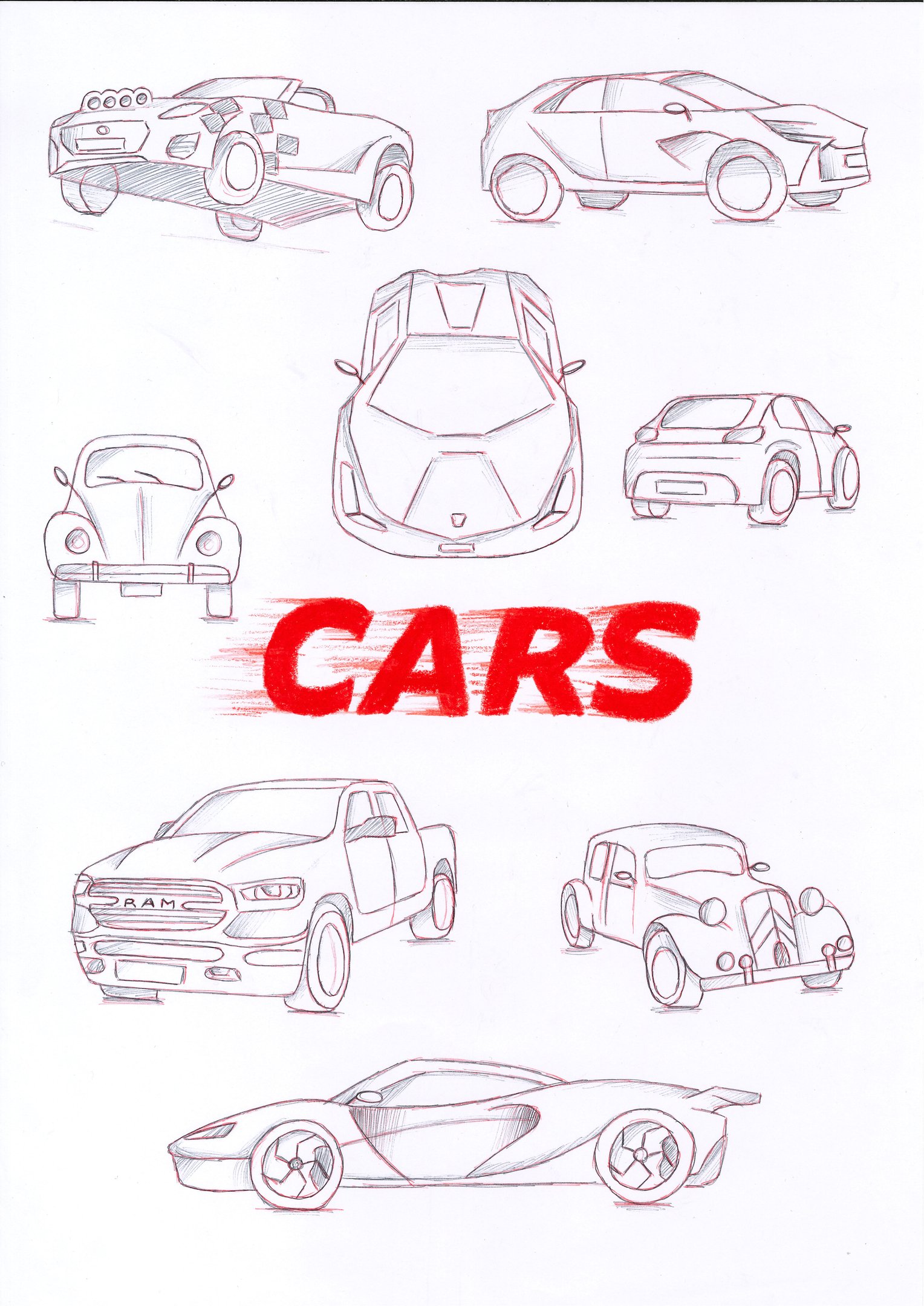 L’idée était de travailler la diversité des formes, les proportions et les perspectives, tout en gardant un style de dessin rapide et dynamique. Le mot “CARS”, marqué en rouge au centre, vient renforcer le côté énergique et donner une identité visuelle percutante à l’ensemble.