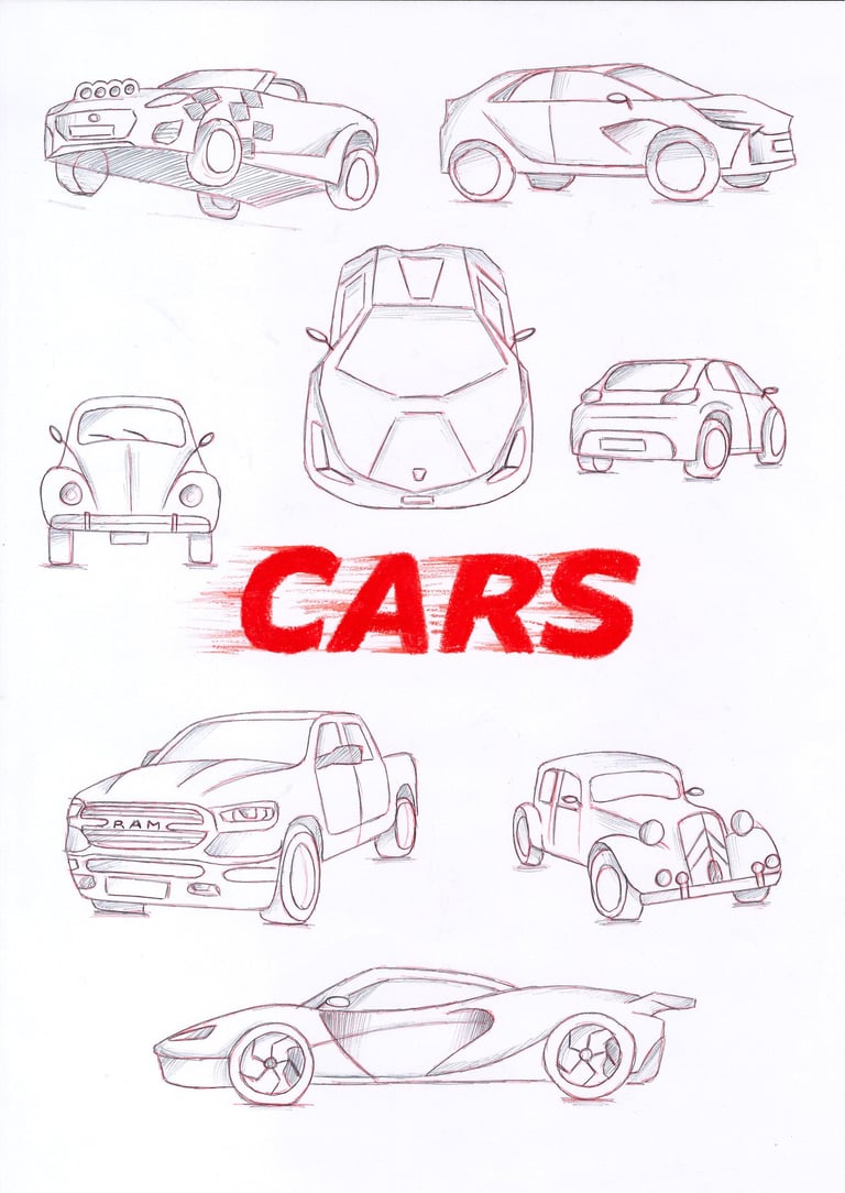 Ce projet est une planche de croquis réalisée au crayon. J’ai choisi de représenter différents modèles, allant de la voiture ancienne aux sportives, en passant par le pick-up et la citadine moderne.