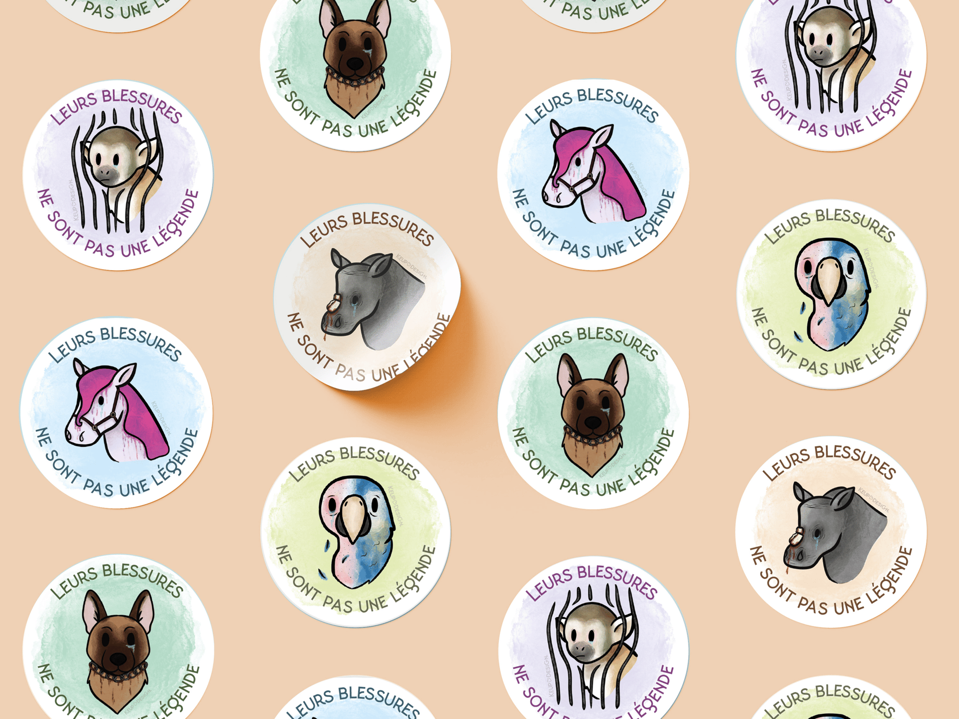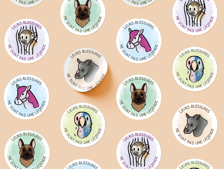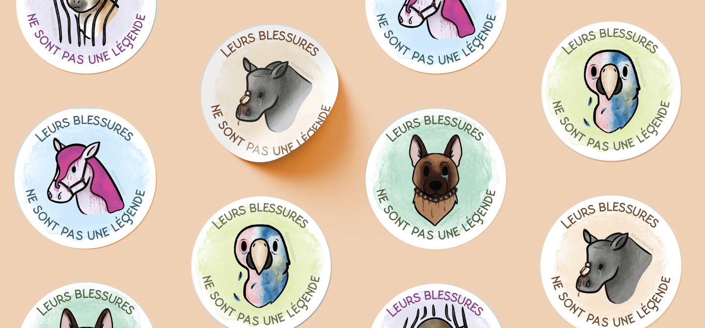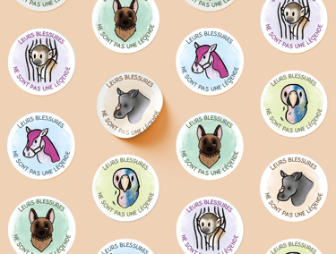 Pour cette série de stickers, j’ai choisi un style doux et illustré pour parler de la maltraitance animale sans choquer frontalement.